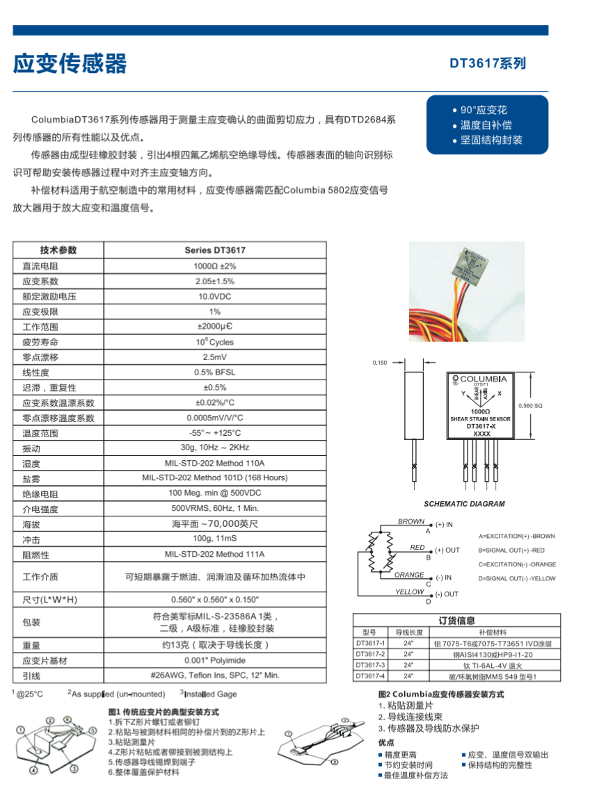 描述:DT3617系列传感器用于测量主应变确认的曲面剪切应力,具有DTD2684系列传感器的所有性能以及优点。